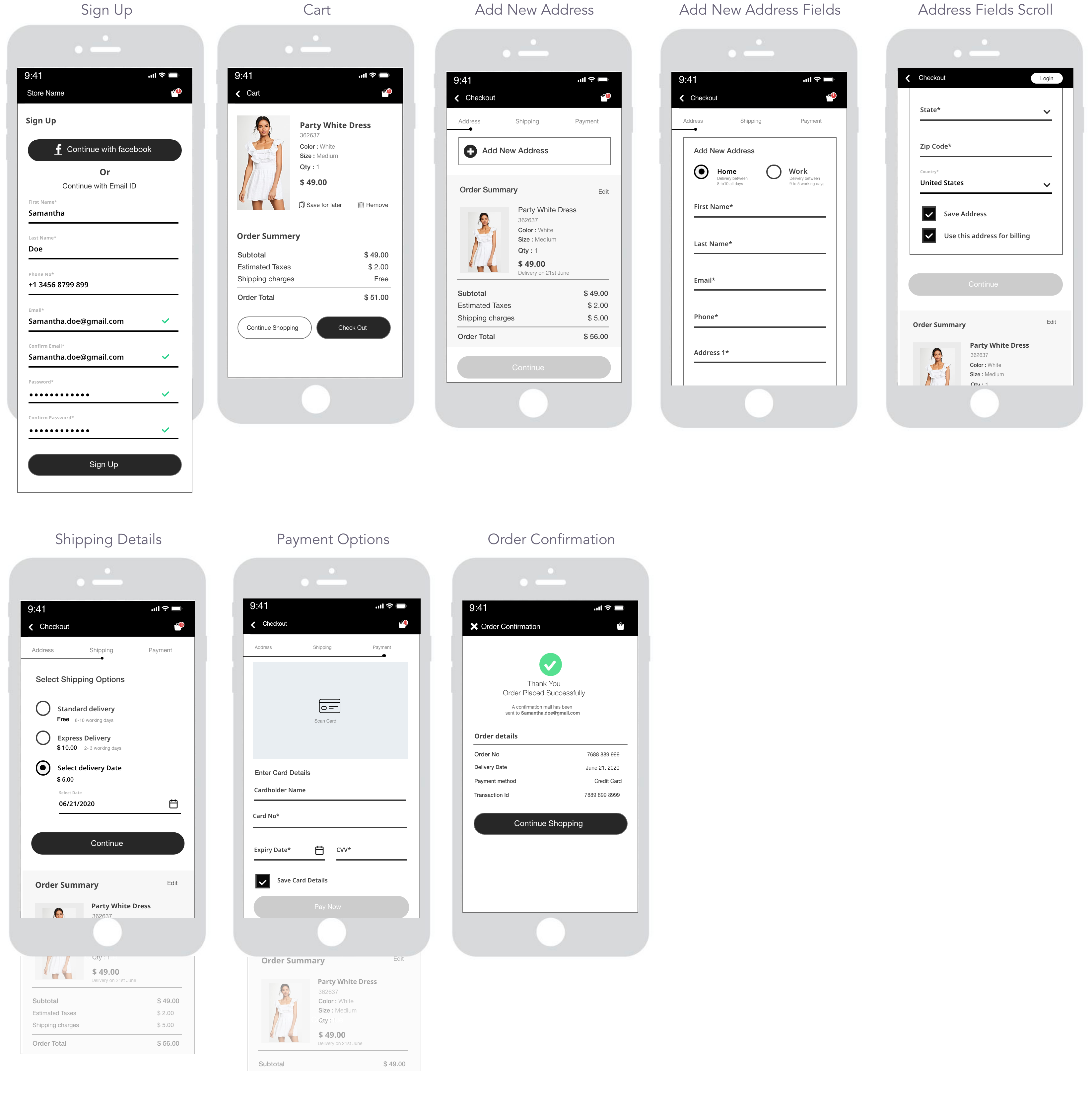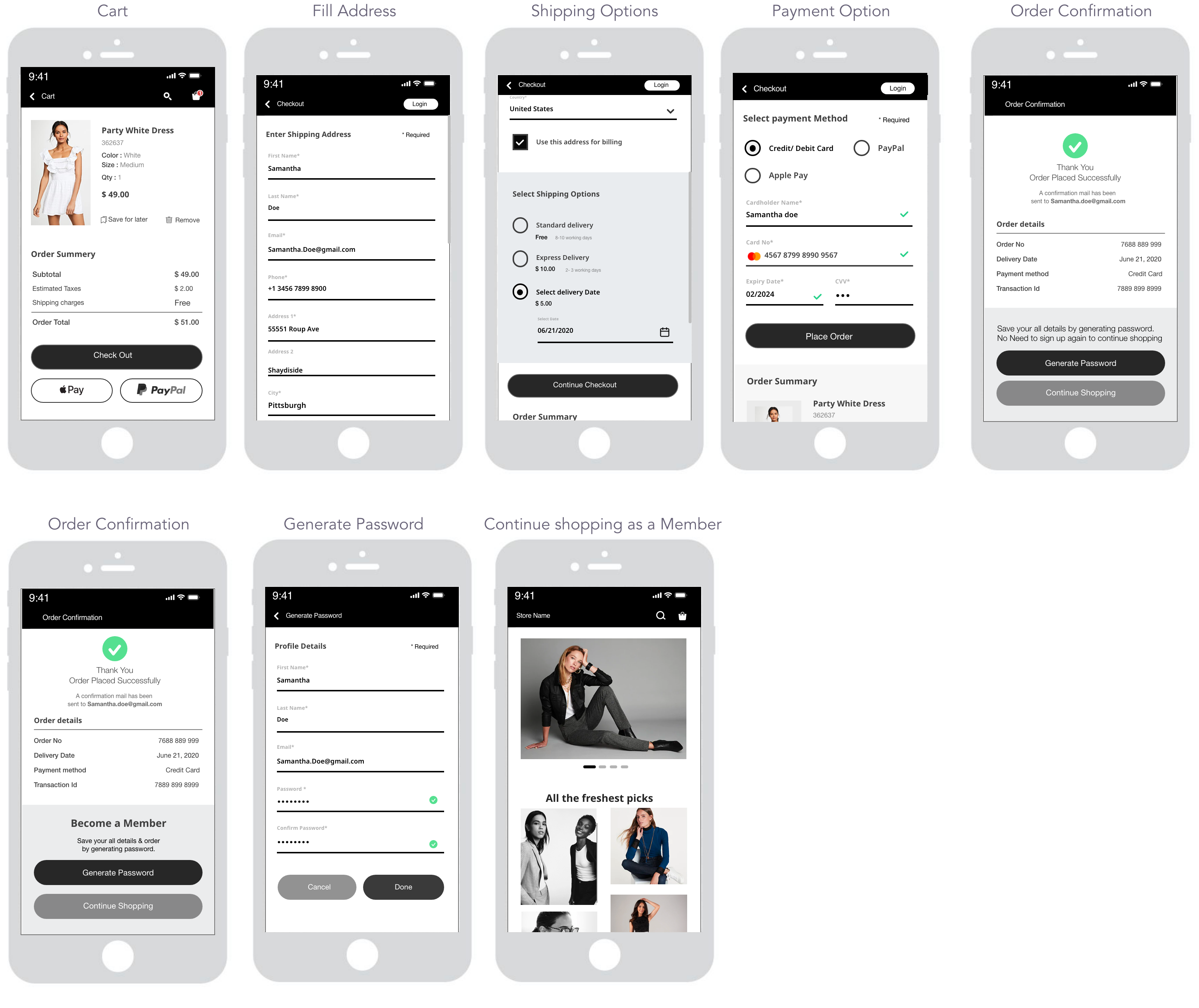 Redesign the mobile checkout form for a new user at an e-commerce site to make it more usable and enjoyable, and to reduce the likelihood of errors. Think about the problem from a user's point of view and determine how to improve the design through effective information architecture, interaction design, and/or visual design.