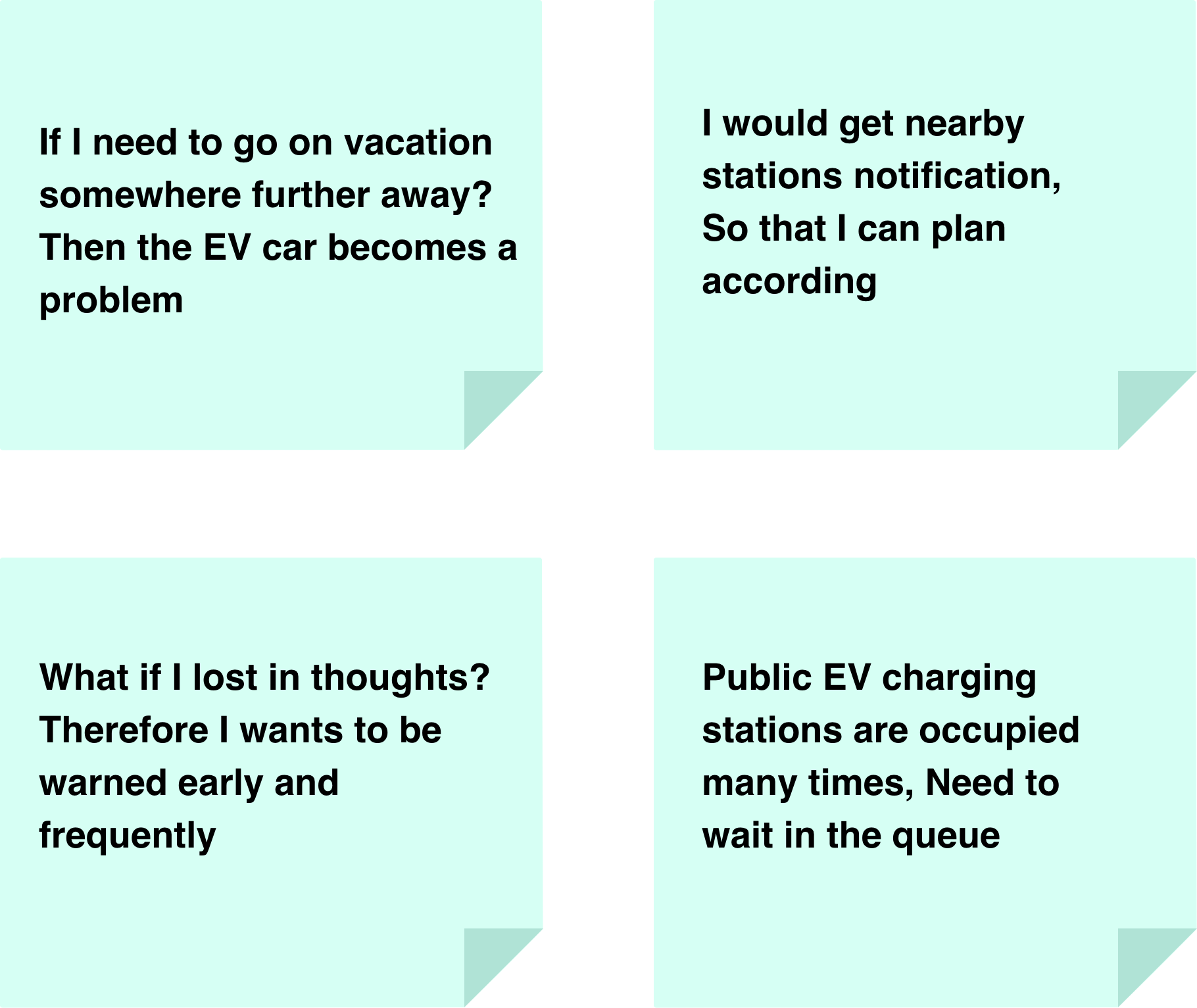 We conducted user interviews to gain information about EV charging. Asked EV car owners & dealers about their overall experience on charging. such as; How frequently you charge your car? How many times do you charge your car at public stations? Do they prefer EV vehicles for a long drive? If yes, then how they manage to charge on the go, etc...